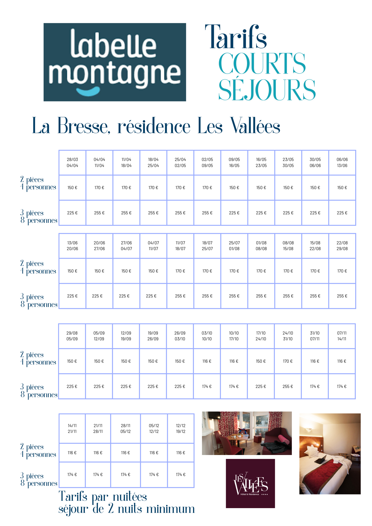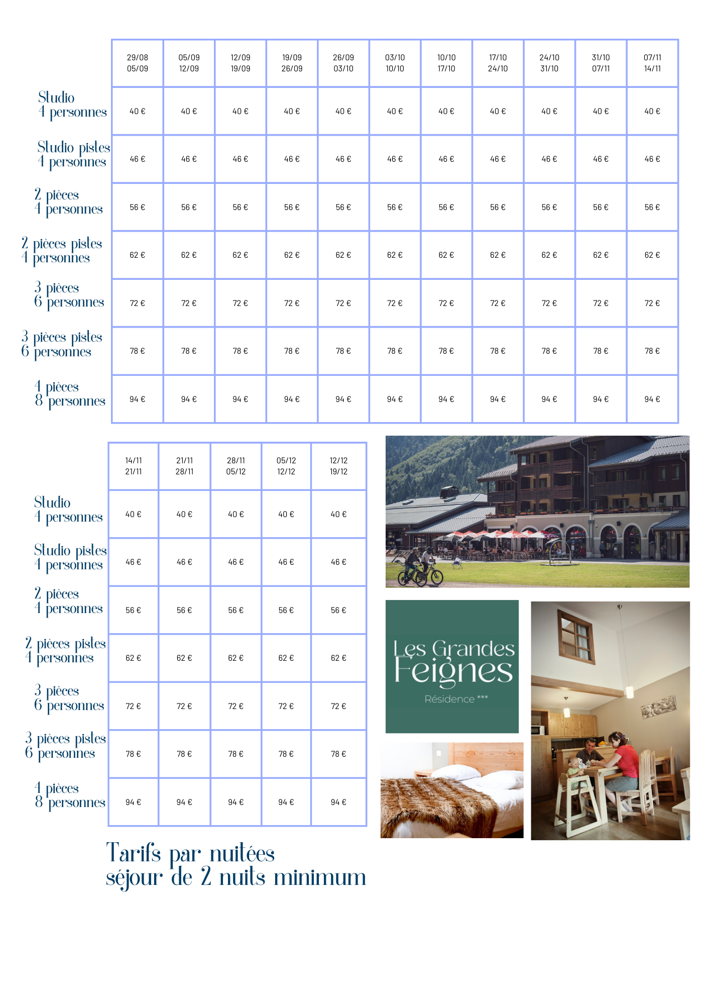 le tarif comprend : hébergement, linge de lit, TV, wifi, animations adultes et enfants en juillet et août devant la résidence, accès a la piscine municipale de La Bresse