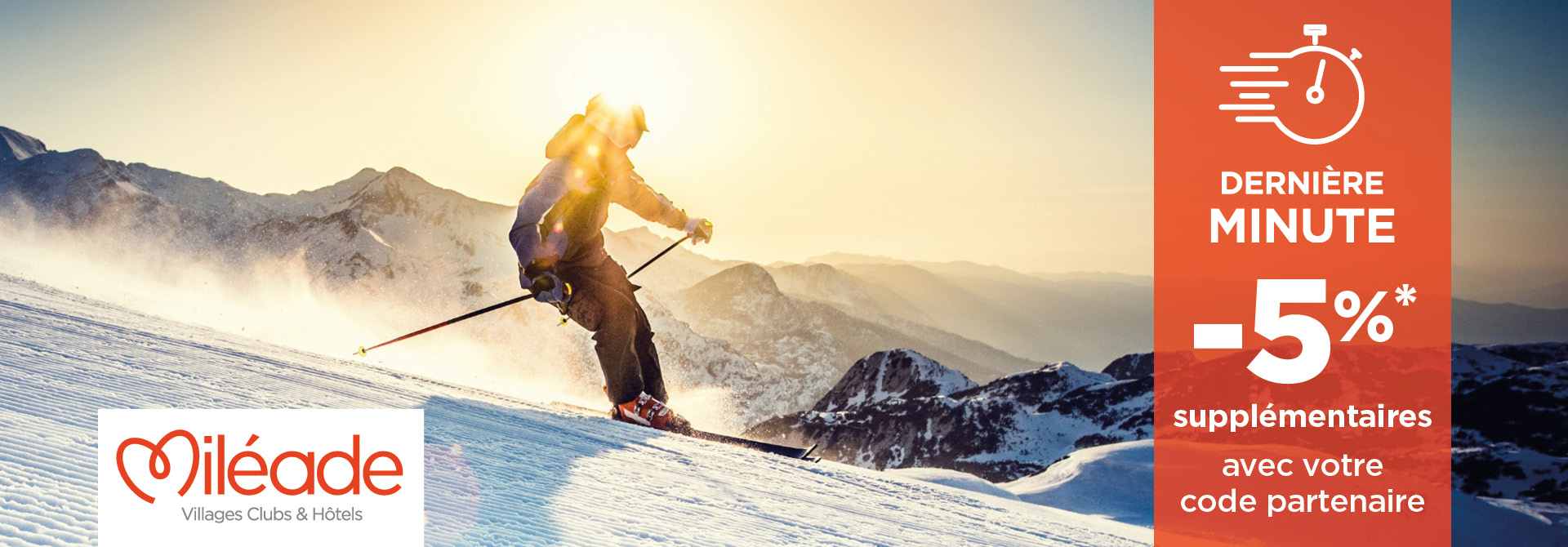 -5%* supplémentaire avec votre code partenaire sur les offres Dernière Minute Hiver soit jusqu’à -25% sur votre séjour montagne : https://reservation-partenaires.mileade.com/derniere-minute-hiver/